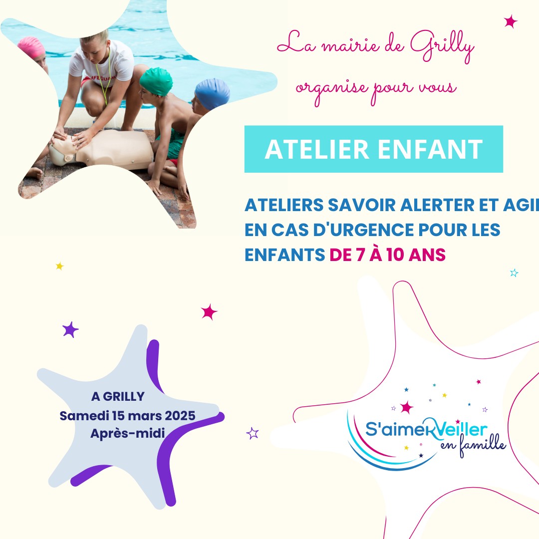 La mairie a le plaisir d’offrir aux jeunes habitants de Grilly âgés de 7 à 10 ans, la possibilité de participer à l’atelier « alerter et agir en cas d’urgence » avec Madame Marie CONTOLI.