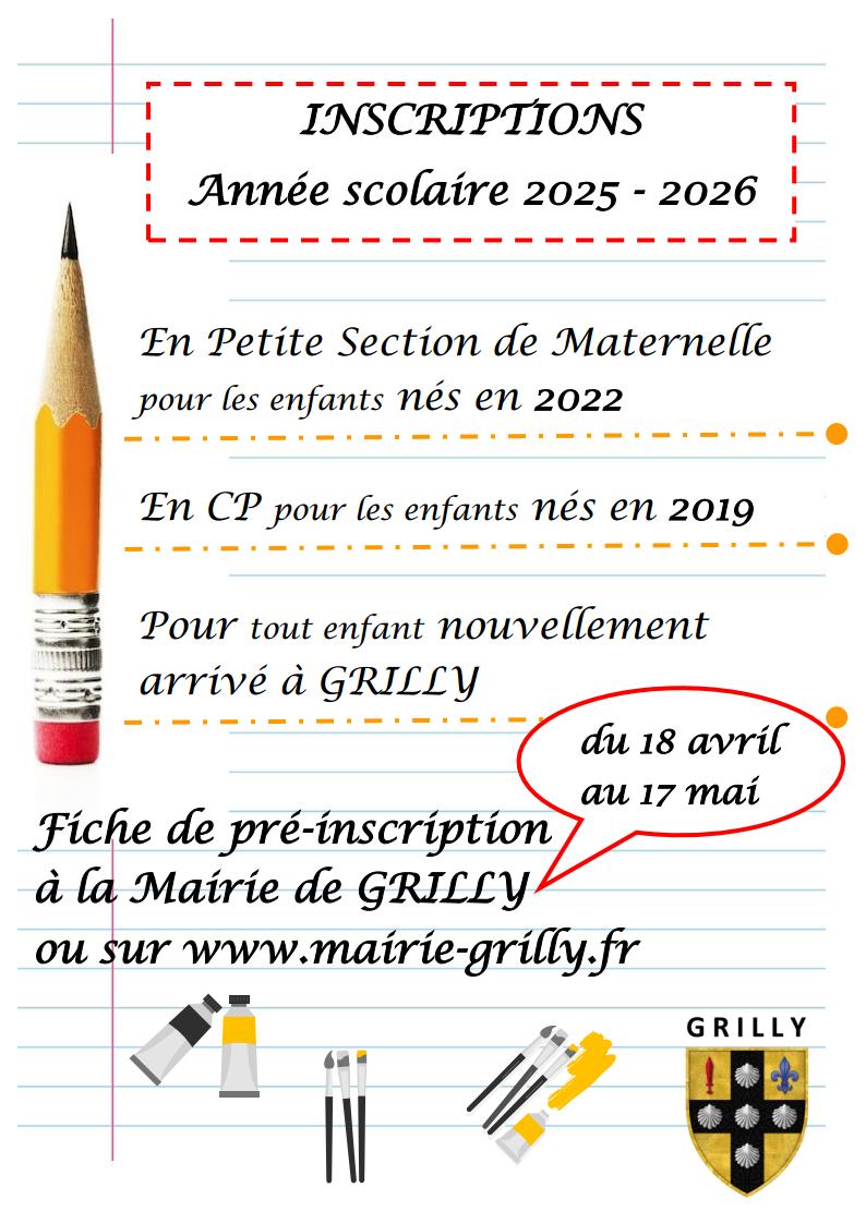 Merci de remplir et déposer le formulaire de pré-inscription en mairie de GRILLY aux horaires d’ouverture habituels.