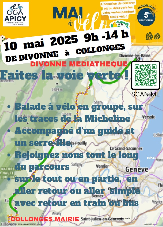 Dans le cadre de Mai à vélo, Pays de Gex Agglo en collaboration avec l’association APICY vous propose une balade en vélo sur la voie verte, encadrée sans chronométrage.