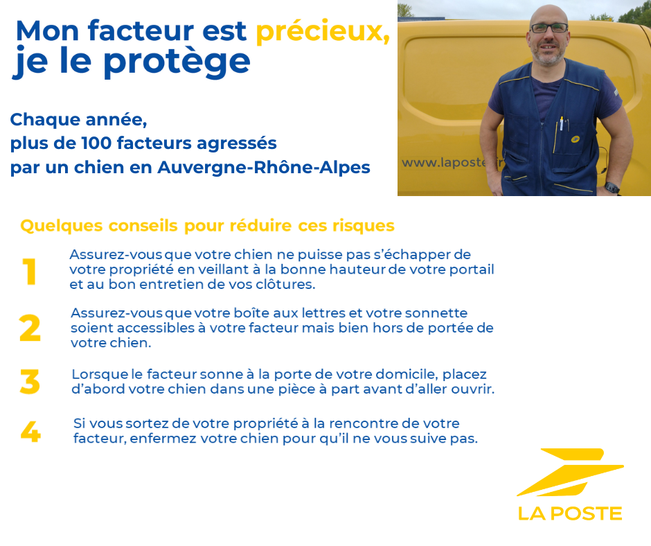 En 2024, en Auvergne Rhône-Alpes, 160 facteurs ont été agressés par un chien lors de leur tournée de distribution. L’agression canine reste une des causes majeures d’accidents du travail pour le facteur. Il est de notre responsabilité à tous de protéger nos facteurs !