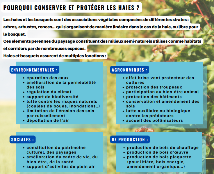 La conservation et la protection des haies et des bosquets sont des enjeux environnementaux importants. Ces éléments pérennes du paysage constituent des milieux semi-naturels utilisés comme habitats et corridors écologiques par de nombreuses espèces.