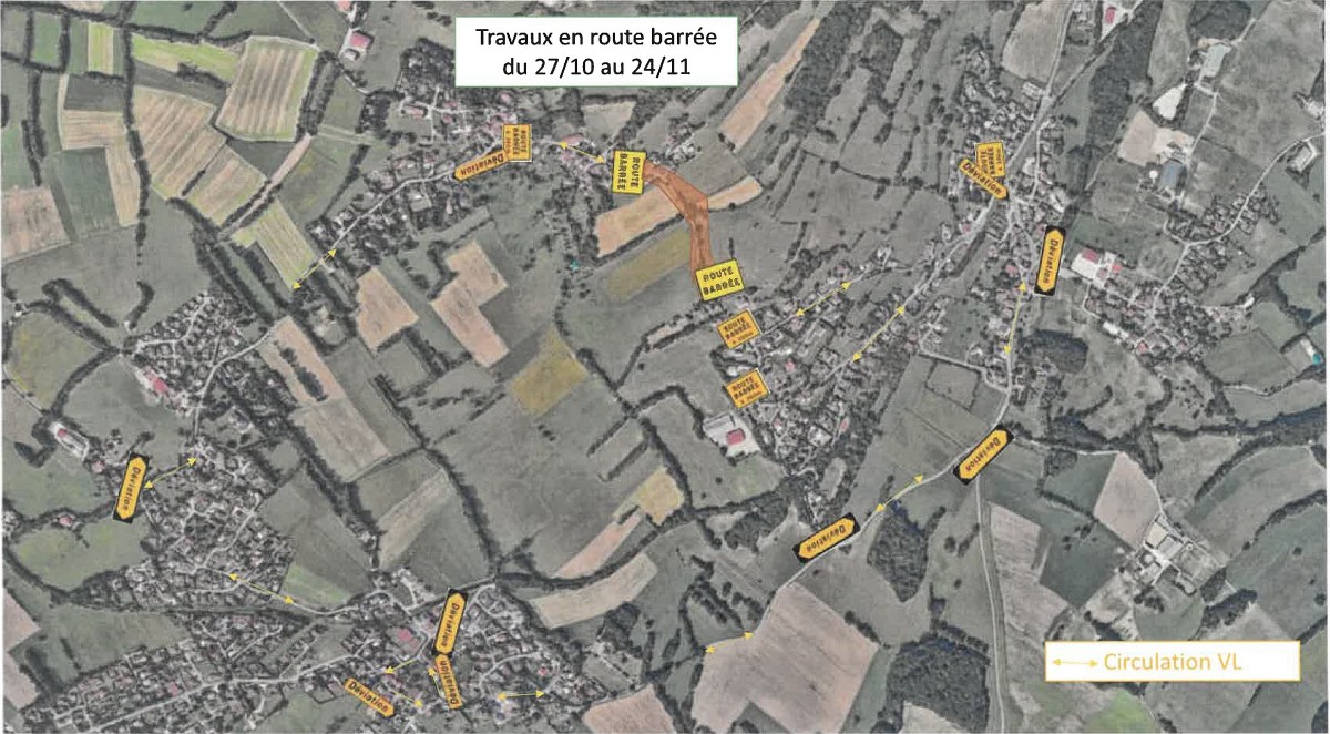 Pendant toute la durée des travaux, la route de Vesancy sera mise en sens unique dans le sens de la descente à partir de la ferme et jusqu’à l’intersection avec la D984C (Gex-Divonne). Il ne sera donc plus possible de « monter » jusqu’à Mourex par la route de Vesancy.